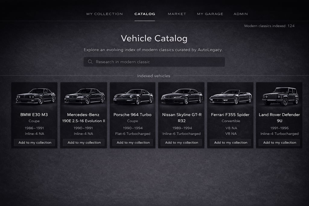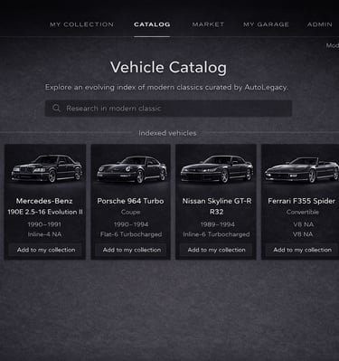 The AutoLegacy gallery will showcase vehicles once the application is live.